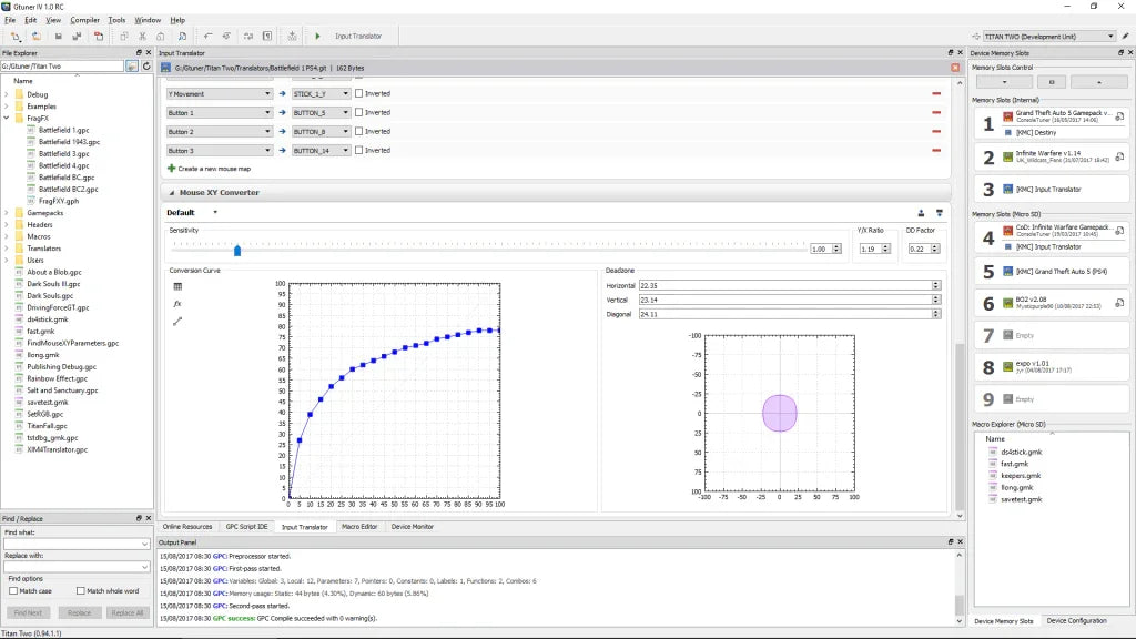 Eine intuitive und flexible Benutzeroberfläche zum Erstellen von Controller- und Tastaturbelegungen sowie Mausempfindlichkeitseinstellungen. Eingabeübersetzer können zusammen mit Gamepacks oder Skripten geladen und so konfiguriert werden, dass sie nur für bestimmte, mit der Titan Two verbundene Controller gelten.