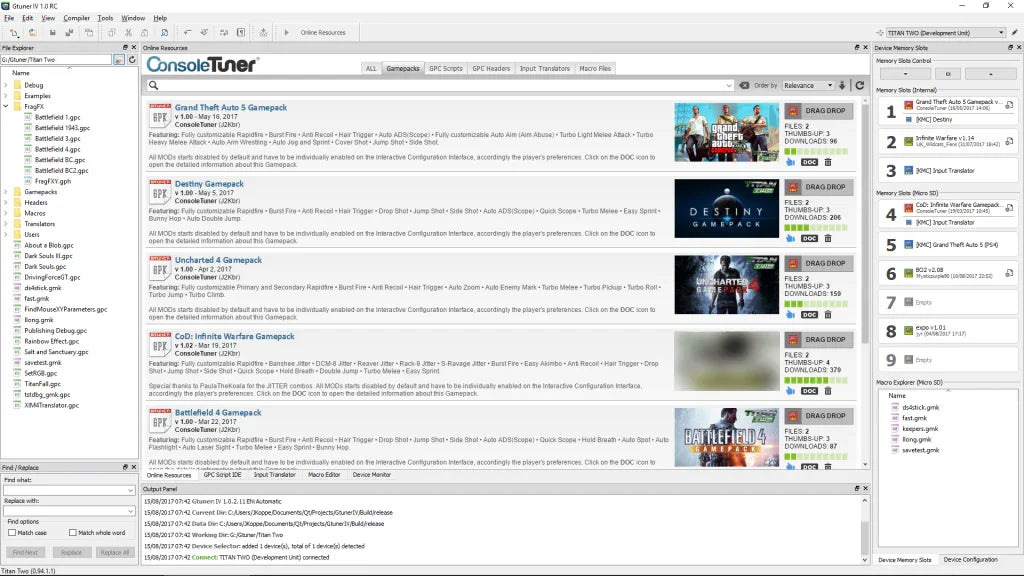 Für den alltäglichen Benutzer bietet Gtuner IV eine intuitive grafische Oberfläche, die das Durchsuchen, Herunterladen und Konfigurieren von sofort einsatzbereiten Gamepacks, Modpacks, Community-Skripten, Tastatur- und Mauskonfigurationen (Eingabeübersetzer) und Binärmakros vereinfacht.